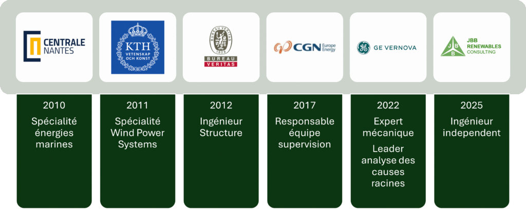 Après un début de carrière chez Bureau Veritas en tant qu’ingénieur structures où j’ai mené des calculs de charges pour de grands projets offshores, j’ai rejoint l’exploitant CGN Europe Energy. J’y ai successivement occupé les postes de superviseur puis de responsable de l’équipe de l’Operation Control Center, assurant le suivi d’un portefeuille de 2,4 GW et pilotant des projets innovants liés à la digitalisation et à la maintenance prédictive.